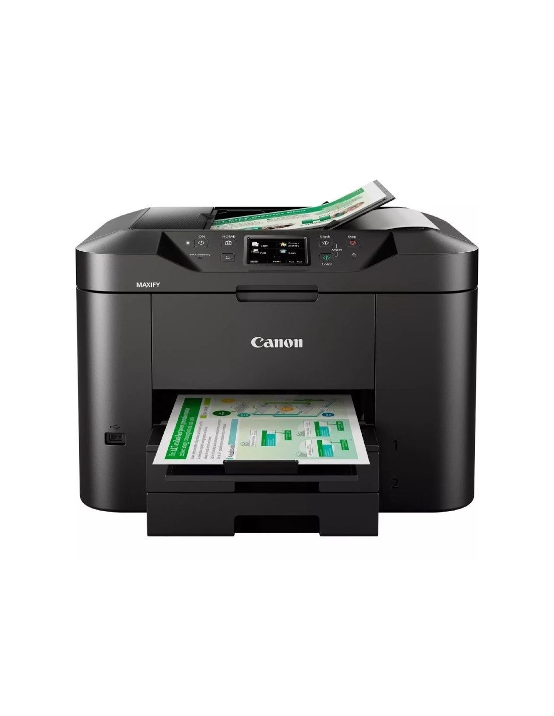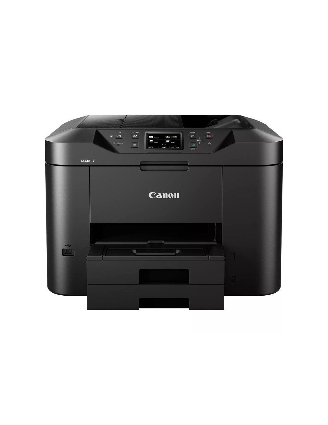La Canon MAXIFY MB2750 es una impresora multifunción 4 en 1 diseñada para oficinas domésticas y pequeñas empresas que requieren productividad y eficiencia. Con funciones de impresión, copia, escaneo y fax, este equipo ofrece una velocidad de impresión de hasta 24 ipm en monocromo y 15,5 ipm en color. Su capacidad de entrada de papel de 500 hojas y el alimentador automático de documentos (ADF) de 50 hojas permiten manejar grandes volúmenes de trabajo sin interrupciones. Además, cuenta con conectividad Wi-Fi, Ethernet y compatibilidad con servicios en la nube, facilitando la impresión y el escaneo desde dispositivos móviles y plataformas en línea.