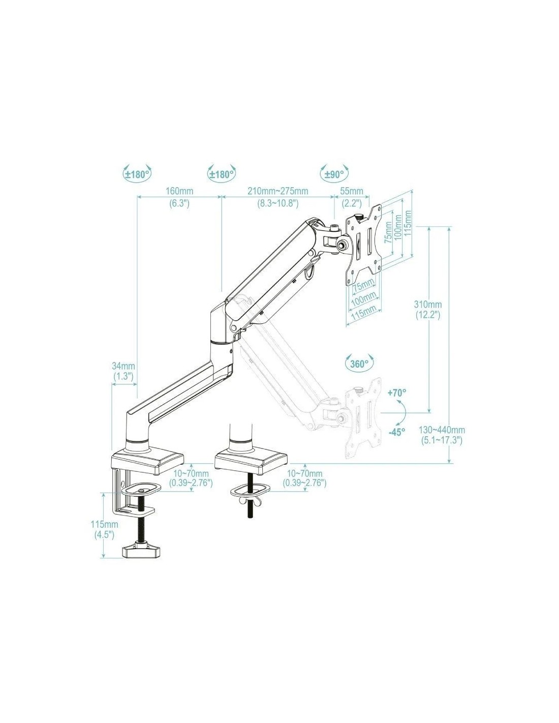 Ángulo de inclinación: +70°/-45°